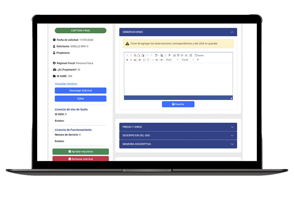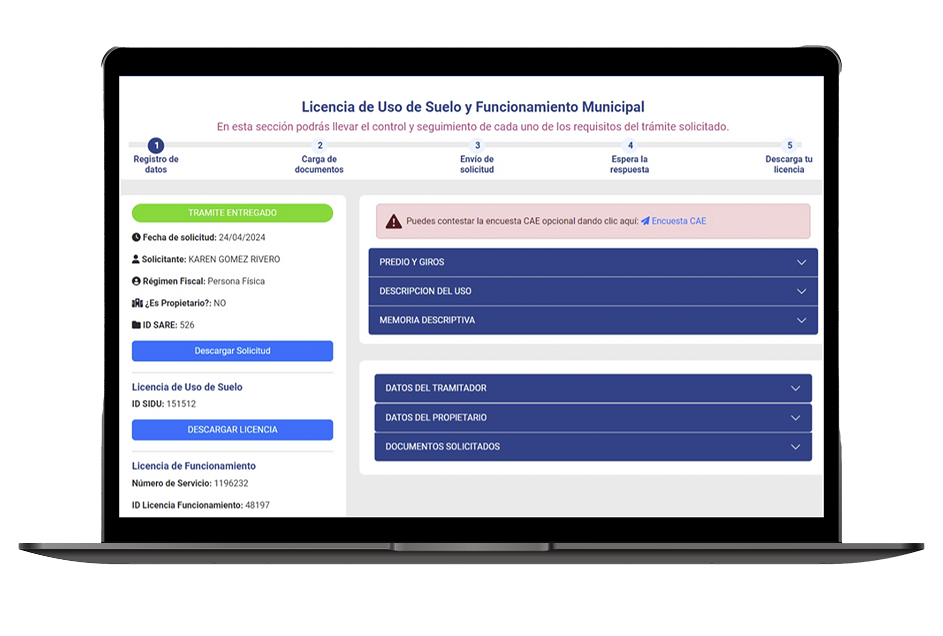 Según la información ingresada, Emprende.GOV detecta automáticamente la modalidad que aplica: SARE, asentamientos irregulares, construcción de bajo o alto impacto, actividad industrial, entre otros. Todas las variantes, en un solo lugar, con un solo formulario.