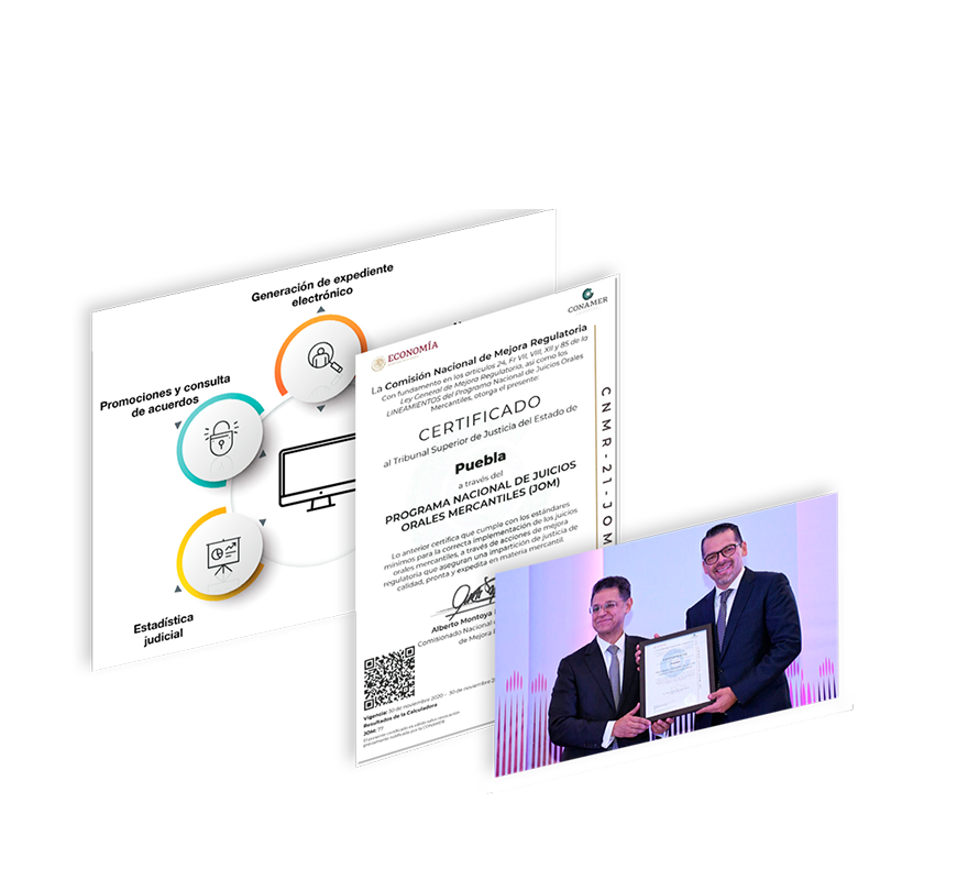 El Poder Judicial enfrentaba procesos presenciales lentos y costosos, con juicios que tardaban meses. El reto fue implementar un sistema de juicios 100% en línea, logrando la primera certificación nacional JOM, reconocida como Mejor Práctica Nacional 2019-2020, reduciendo tiempos de meses a semanas.
