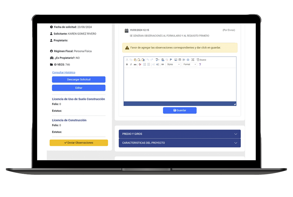 Envía tu solicitud y monitorea en tiempo real quién la tiene, en qué etapa está y el tiempo estimado para su resolución. Salvo observaciones, no tendrás que hacer nada más. Al estar listo, recibirás una notificación por correo, sistema o WhatsApp para pagar en línea con tarjeta, PayPal, CoDi, SPEI o en tiendas autorizadas. El pago se acredita al instante y tu licencia o permiso se libera automáticamente.
