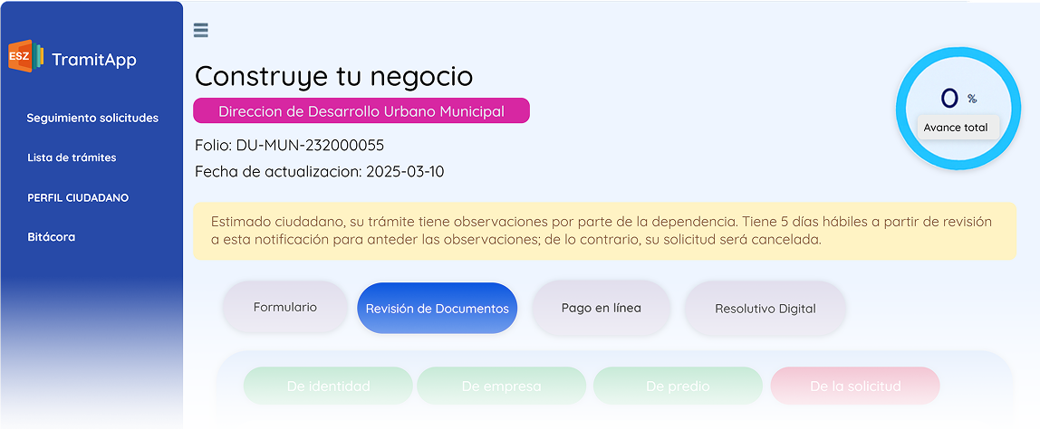 Trami.GOV distribuye solicitudes a la ventanilla correcta, bloquea lo ya aprobado y guía al ciudadano con observaciones claras, semáforos y plazos definidos.